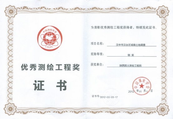 优秀测绘工程奖证书